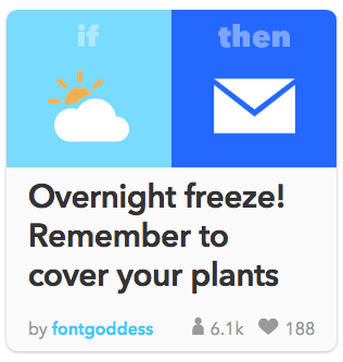 - IFTTT: If the weather is supposed to drop below freezing, then I get a text the night before reminding me to cover my garden plants.
