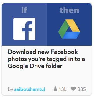 - IFTTT: If I'm tagged in a photo on Facebook, then a copy is saved to my Google Drive